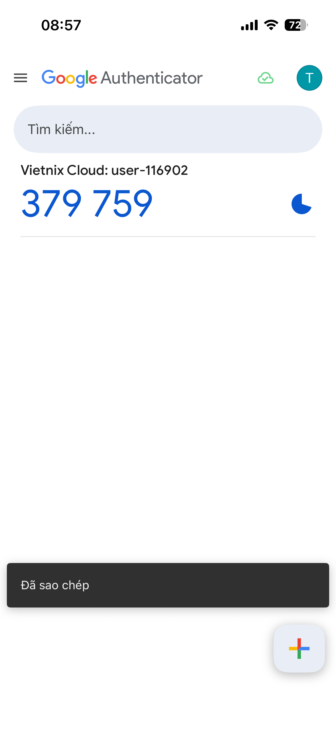 Google Authenticator sẽ tự động thêm Vietnix Cloud vào danh sách tài khoản và bắt đầu tạo mã 6 chữ số làm mới mỗi 30 giây.